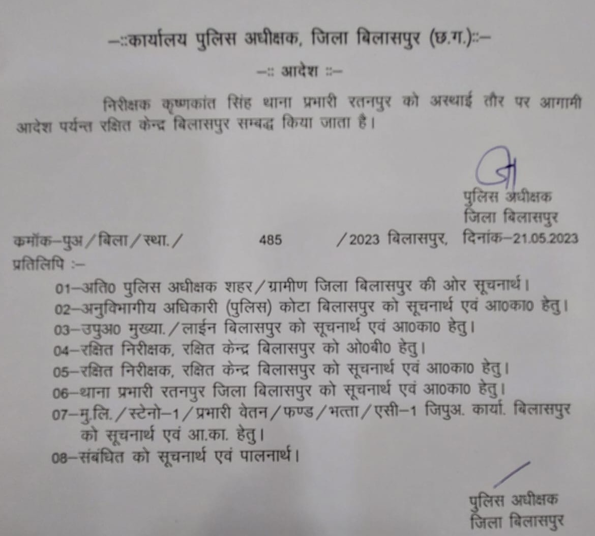 CG BREAKING : रतनपुर मामले में थानेदार को किया गया अटैच... एसपी ने गठित की जांच दल... एएसपी सहित 3 अधिकारी करेंगे मामले की जांच