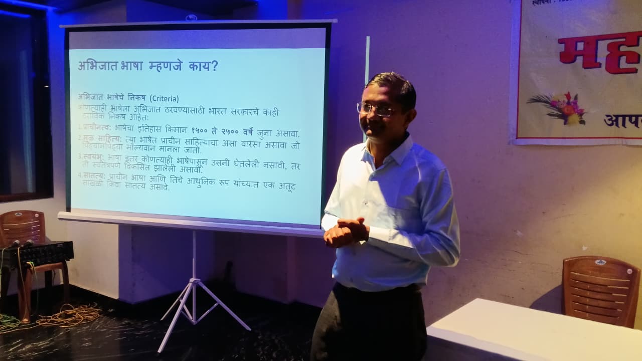 इनसे पहले कैंसर रोग विशेषज्ञ डॉ. अनिकेत ठोके ने पावर प्रेजेंटेशन के माध्यम से मराठी के इतिहास की ज्ञानवर्धक जानकारी दी। डॉ. ठोके ने बताया कि भारत में तीसरी सर्वाधिक बोली जाने वाली भाषा मराठी है। पहले नंबर पर हिंदी और दूसरे नंबर पर बंगाली है। इस मौके पर उन्होंने बडे पर्दे पर छत्रपति शिवाजी महाराज के हस्तलिखित पत्र भी दिखाए और मराठी के महत्व को समझाया।
