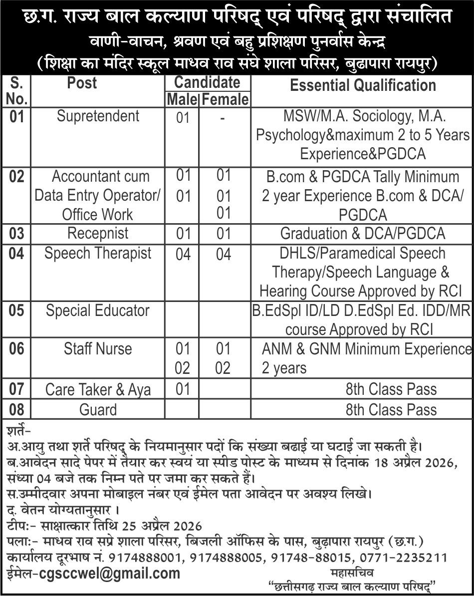 इसी तरह स्पीच थेरेपिस्ट के लिए 8 पद, स्टाफ नर्स के 6 और केयर टेकर के 2 पद के लिए आवेदन मंगाए गए है। परिषद के नियमानुसार आयु और शर्ते बढ़ाई या घटाई जा सकती है। आवेदन सादे पेपर में तैयार कर स्वयं या स्पीड पोस्ट के माध्यम से 18 अप्रैल को शाम 4 बजे तक शिक्षा का मंदिर स्कूल माधव राव सप्रे शाला परिसर बूढ़ापारा रायपुर में जमा करना होगा। साक्षात्कार की तिथि 25 अप्रैल 2026 निर्धारित की गई है।