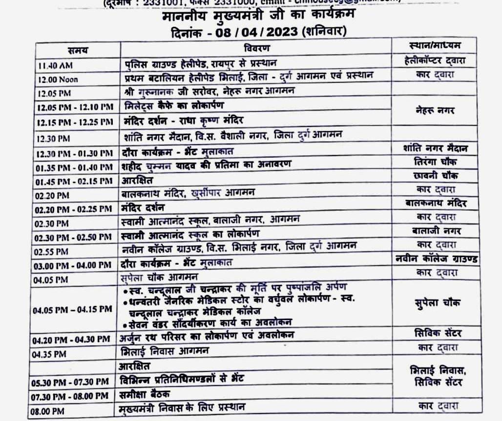 दोपहर 12.20 बजे सीएम बघेल नेहरू नगर स्थित राधाकृष्ण मंदिर पहुंचकर दर्शन करेंगे और पूजा कार्यक्रम में शामिल होंगे। मंदिर दर्शन के बाद सीएम दोपहर 12.30 बजे शांति नगर, दशहरा मैदान में आयोजित भेंट-मुलाकात कार्यक्रम में पहुचेंगे। भेंट मुलाकात के बाद वे दोपहर 1.50 बजे वैशाली नगर पहुंच वेंडिग जोन में मिलेट्स कैफे का लोकार्पण एवं हितग्राहियों को प्रमाण पत्र वितरित करेंगे। इसके पश्चात वे दोपहर 2 बजे छावनी स्थित शहीद चुम्मन यादव की प्रतिमा का अनावरण करेंगे।