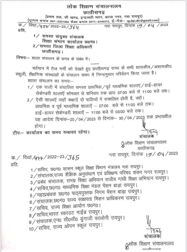 रायपुर। छत्तीसगढ़ में लगातार बढ़ रही गर्मी को देखते हुए स्कूल शिक्षा विभाग ने समय को लेकर एक बार फिर बदलाव के आदेश जारी कर दिए हैं। प्रदेश में लू जैसे हालात और बच्चों के स्वास्थ्य को लेकर लोक शिक्षण संचालनालय ने विषय की समीक्षा के बाद निर्णय लेते हुए स्कूल लगाए जाने के समय में परिवर्तन का आदेश जारी किया है।