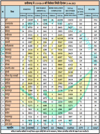प्रदेश की राजधानी रायपुर में लगातार मरीजों की संख्या में इजाफा हो रहा है और इस वक्त सबसे ज्यादा सक्रिय मरीज भी रायपुर में ही हैं। इसके बाद प्रदेश के बड़े जिलों में दुर्ग, राजनांदगांव, बिलासपुर, जांजगीर—चांपा, जगदलपुर सहित स्वास्थ्य विभाग द्वारा सूचीबद्ध कुल 28 जिले हैं, जहां हर दिन पॉजिटिव मरीजों की संख्या में इजाफा हो रहा है।